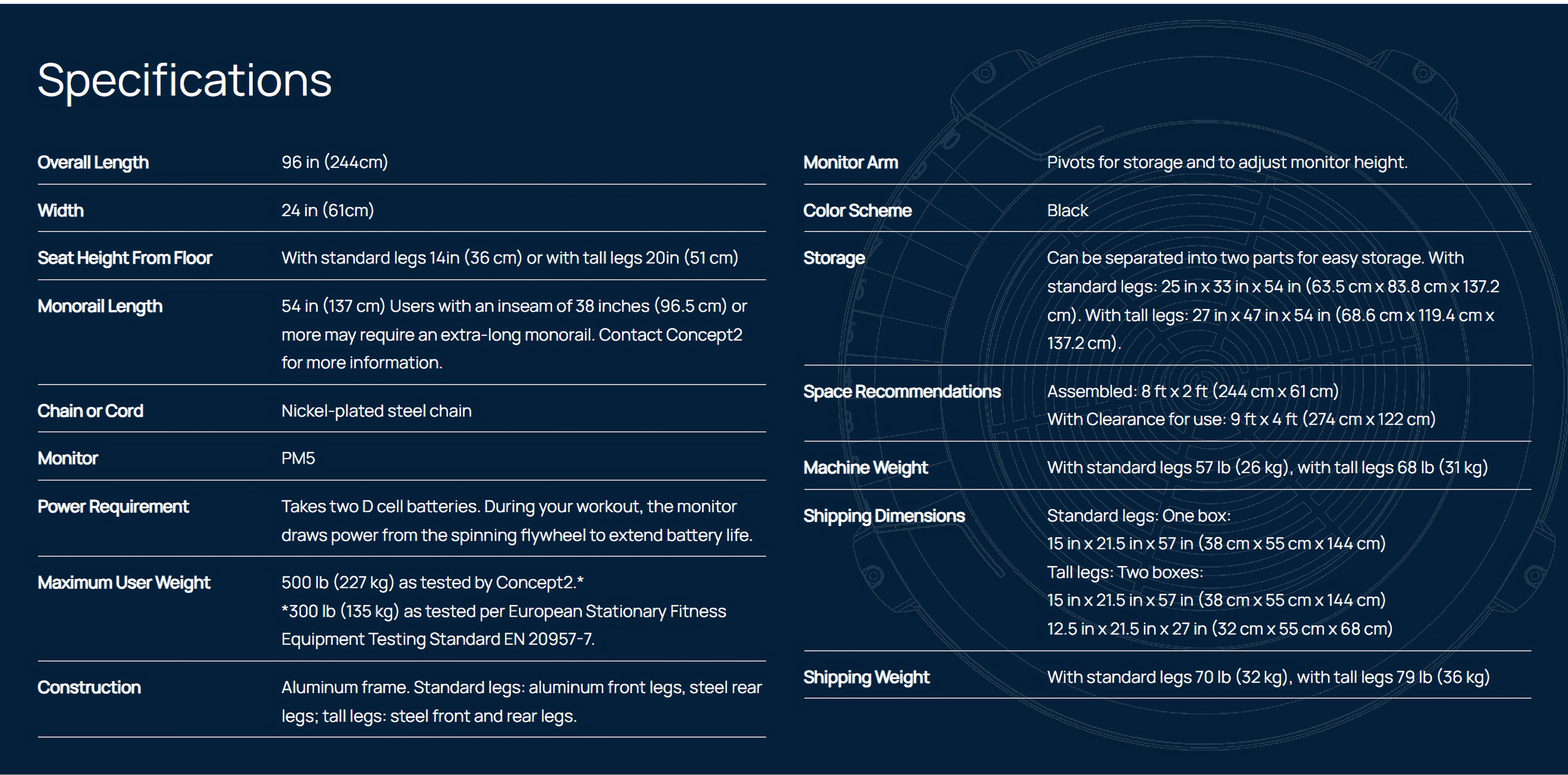 The RowErg is available with either standard or tall legs. The standard legs give a 14-inch (36 cm) seat height while the taller legs place the seat 20 inches (51 cm) from the floor. The higher frame means easier on-and-off for those with tired knees or mobility considerations, but is not required for taller users, and both machines will fit inseams up to 38 inches (96.5 cm). Rowers with an inseam longer than this may require our extra-long monorail.